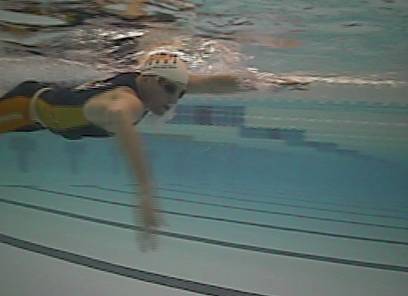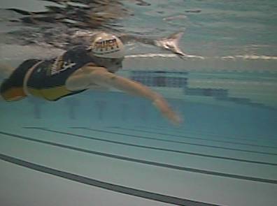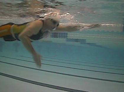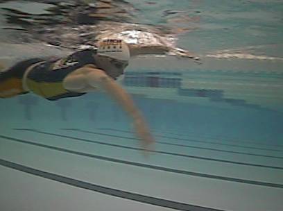 Figure IV. Vertical forearm 2 Now the shoulder has moved back towards the torso (or the torso has moved forward through the water) and the hand and forearm are entirely vertical. There may be some internal rotation of the arm (towards the torso) as the body rotates forward to allow the left arm to extend fully. The lat remains the primary mover through this point in the stroke. |